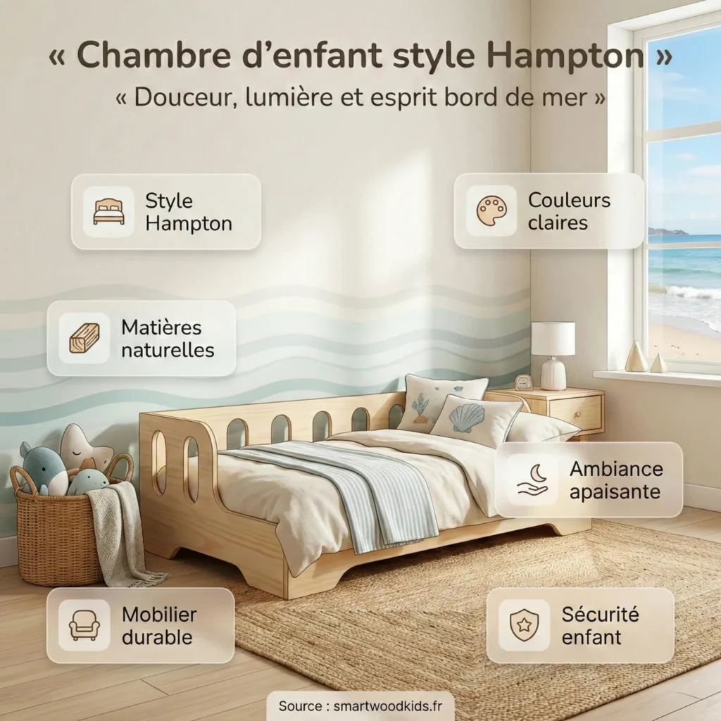 Le style Hampton dans une chambre d’enfant, c’est une excellente idée si vous aimez cette élégance côtière, à la fois lumineuse et décontractée. Loin d’une déco trop formelle, l’objectif est de créer un espace apaisant, sûr et vraiment fonctionnel au quotidien. On mise sur des couleurs douces, des matières naturelles et des meubles pensés pour durer, qui accompagnent l’enfant au fil des années. Voyons comment traduire cette ambiance en une chambre harmonieuse et intemporelle, entre chic discret et esprit bord de mer.