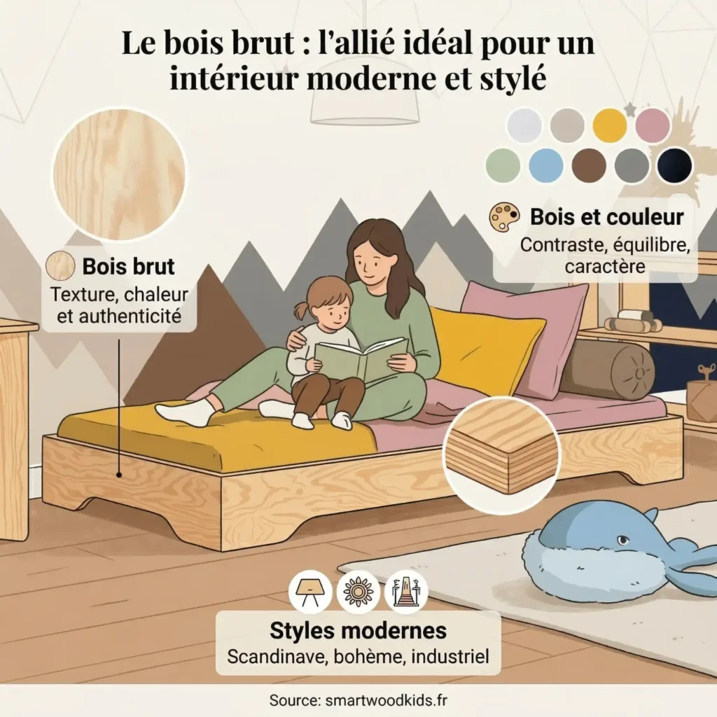 | Bois Brut Clair | Couleurs vives (bleu cobalt, vert émeraude, orange) | Dynamique, audacieux, lumineux |