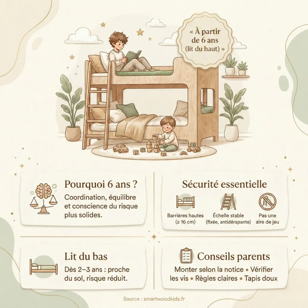 Selon la norme EN 747 et les experts en sécurité, le lit du haut, c’est pas avant 6 ans. Le lit du bas, par contre, c’est OK pour les plus jeunes (vers 2-3 ans).