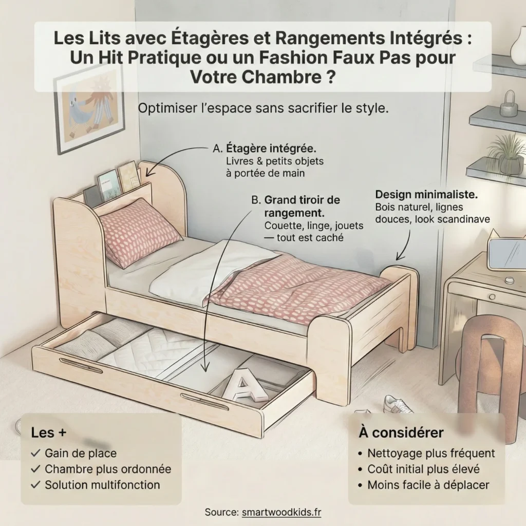 Les lits avec étagères et rangements intégrés, c’est un peu le coup de baguette magique pour réinventer la façon dont on organise sa chambre. Surtout aujourd’hui, où les appartements se font plus petits et les studios, la nécessité d’exploiter chaque centimètre carré devient primordiale. Ces lits multifonctions ne font pas que vous offrir un coin douillet pour dormir ; ils embarquent des solutions de rangement astucieuses, ce qui les rend super attrayants face aux meubles classiques. La grande question, c’est : est-ce une solution pérenne pour vos soucis d’espace, ou juste une mode passagère ? On va décortiquer ensemble les pour et les contre de ces lits pour vous aider à y voir plus clair.