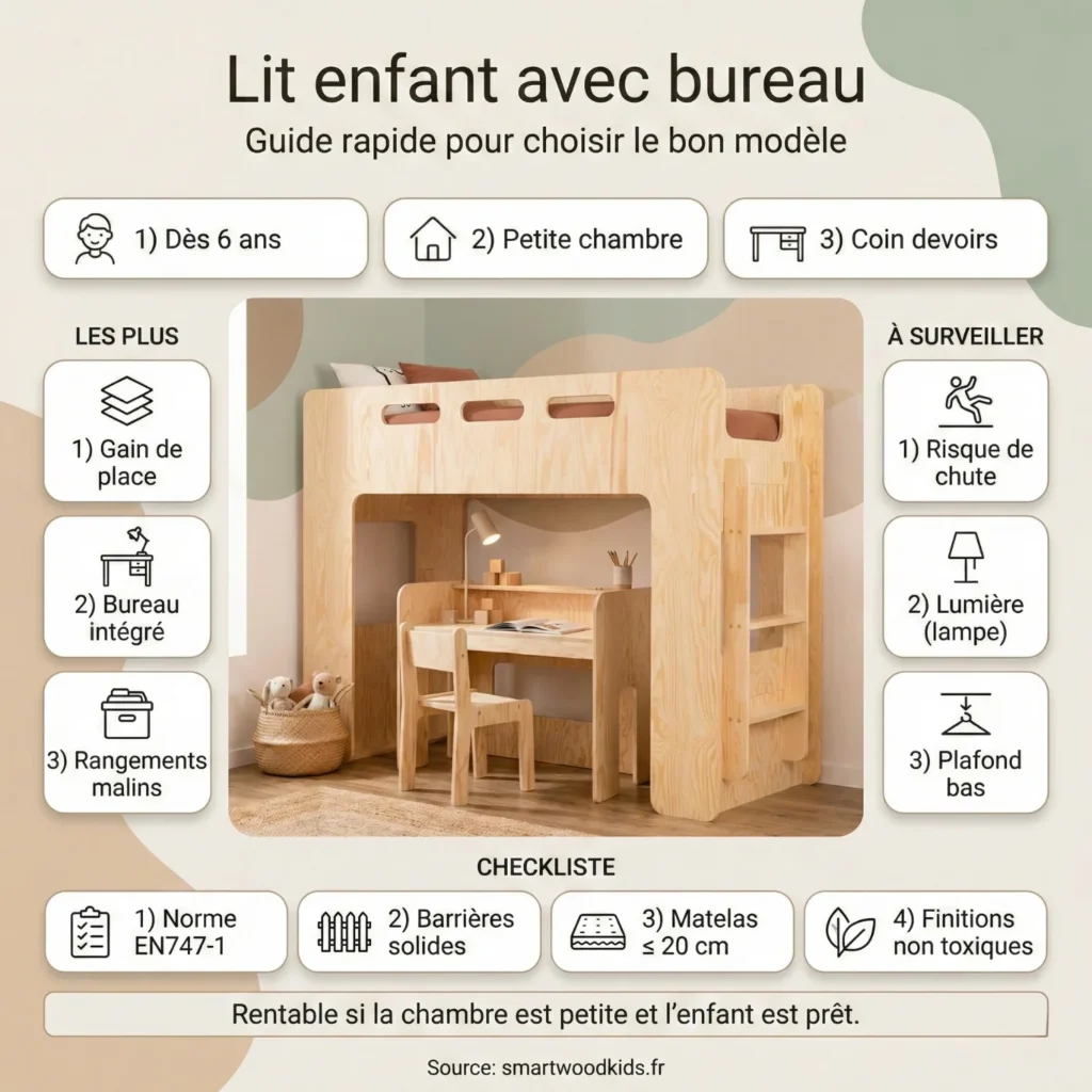 Ces meubles aident aussi à développer l’autonomie et les bonnes habitudes chez l’enfant, qui apprend à ranger son coin d’étude et sa chambre. En plus, souvent, acheter un seul meuble multifonction revient moins cher que d’acheter un lit, un bureau et des étagères séparément. Bon, il y a quand même quelques points à considérer. Le plus gros souci, c’est le risque de chute. Si l’enfant est du genre à beaucoup gigoter la nuit ou qu’il est encore un peu petit, il faut des protections adaptées et une utilisation conforme aux recommandations du fabricant. Faire le lit en hauteur, ça peut être moins pratique, et en été, sous le plafond, la chaleur peut être plus marquée en hauteur. Il faut donc penser à une bonne ventilation. Et bien sûr, il faut vérifier la hauteur sous plafond de la pièce.