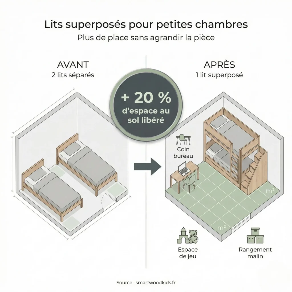 | Type de lit superposé | Dimensions typiques (surface au sol) | Principal avantage pour les petites chambres | Usage idéal | Points à surveiller |
