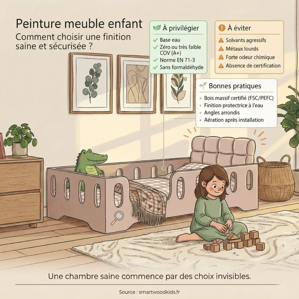 Oui, si elles sont bien formulées pour les meubles d’enfants : à faibles émissions de COV, avec des informations rassurantes sur la qualité de l’air intérieur (comme A+), et en limitant au maximum le formaldéhyde. C’est un très bon choix.