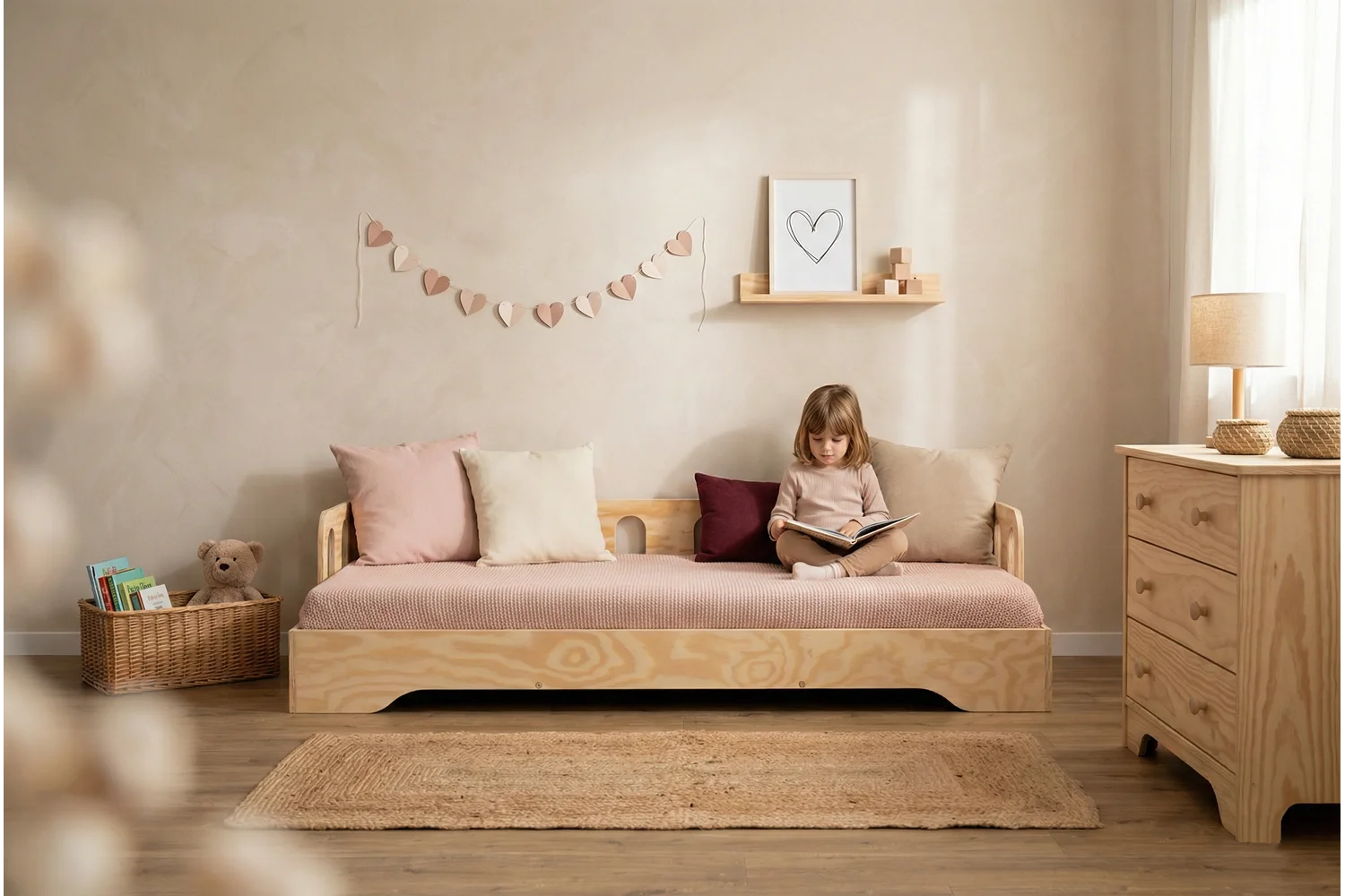 Sa conception ouverte et basse permet un accès facile, favorisant ainsi le développement de l’autonomie de l’enfant, tandis qu’une barrière avec des découpes longitudinales sur le long côté du lit offre un appui confortable. Fabriqué en contreplaqué de pin de haute qualité, ce lit, disponible en 11 couleurs et 20 tailles, s’intègre parfaitement dans tout intérieur.