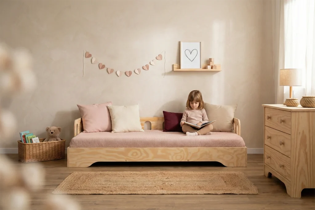 Lit simple enfant avec barrière, TILA 1 est conçu pour les tout-petits, inspiré par la philosophie Montessori.